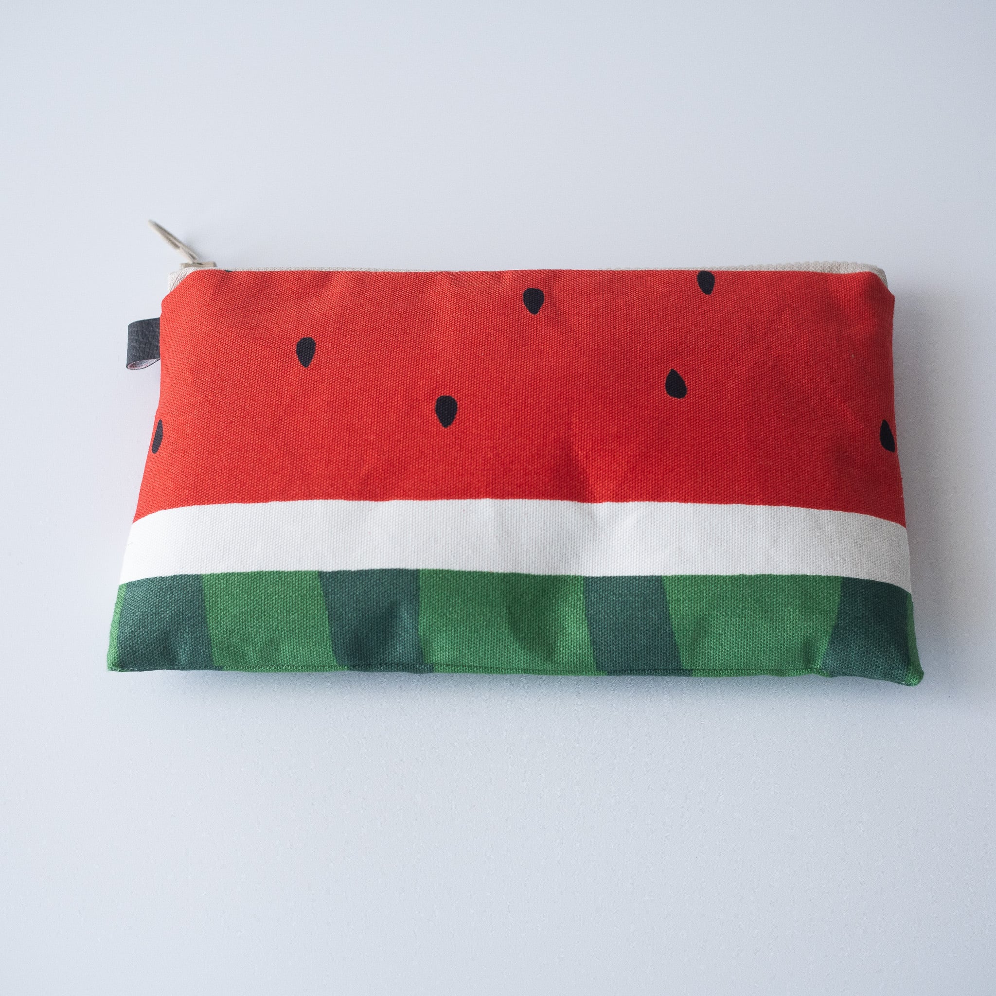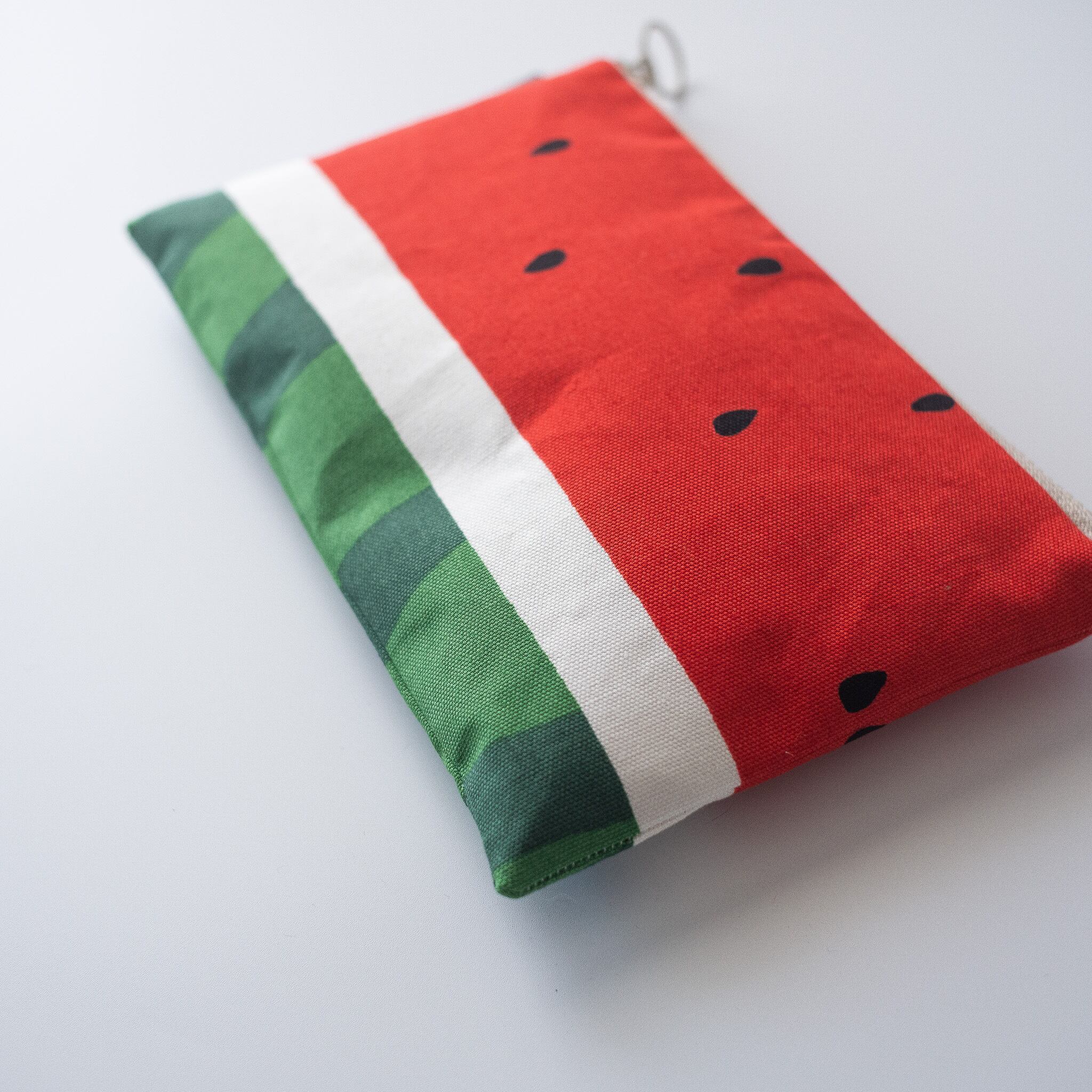 カラフルで愛らしいスイカの断面がデザインされたこのポーチは